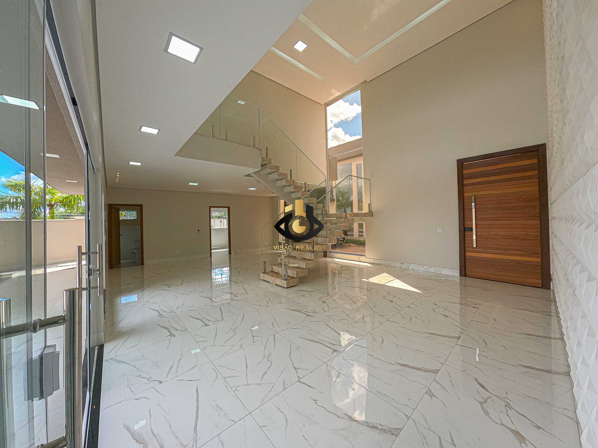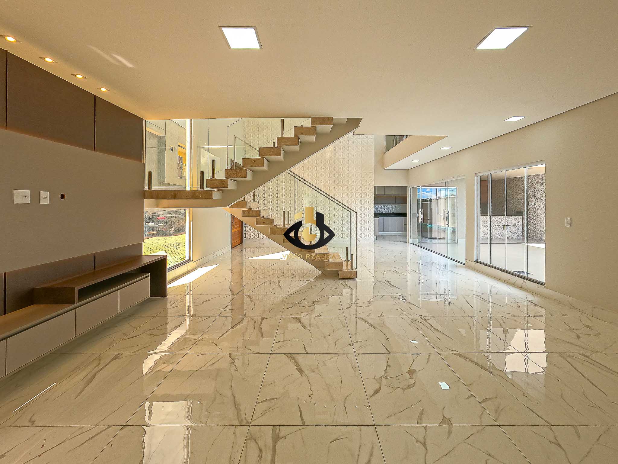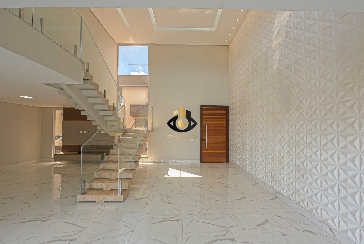 • Sala de estar com pé-direito duplo em conceito integrado, criando amplitude e fluidez entre os ambientes